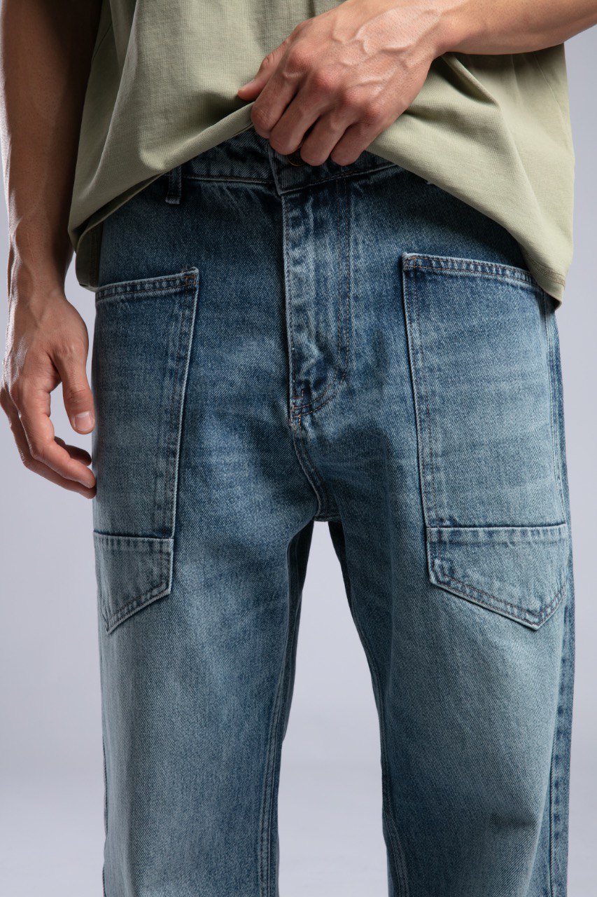 Baggy light blue denim jeans with relaxed cut and street look.